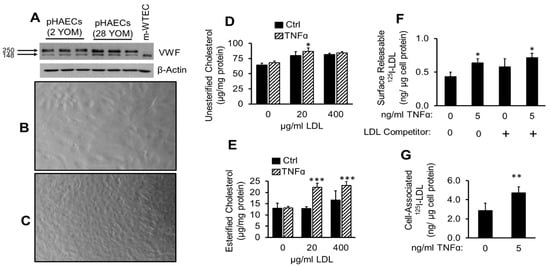 TNFα enhances cholesterol accumulation and LDL binding to pHAECs. (A) Expression of von Willebrand factor (VWF) by 2- or 28-year-old male (YOM) pHAECs, lots 70001318, 63233442, respectively. Mouse wild-type endothelial cells (m-WTEC) were used a comparison. (B,C) ranges of pHAEC confluency used. Images are at 20× magnification. (D–E) pHAECs were treated with the indicted concentration of human LDL without (Ctrl) or with 100 ng/mL TNFα for 24 h. Unesterified cholesterol and cholesteryl esters were determined as described under Section 2. n = 5. (F) Cells were pre-treated with 0 or 5 ng/mL TNFα in serum medium as described under Section 2. After incubation at 37 °C, the amount of 125I-LDL released to serum-free medium at 4 °C without (0) or with 20 folds unlabeled LDL competitor (+) was determined as the surface 125I-LDL. (G) The experiment was performed as in (E), and the amount of radioactivity associated with the cell was determined. (C,D) n = 3. *, **, ***, p < 0.05, 0.01, 0.001, relative to the corresponding Ctrl.3.2. ACAT inhibitor does not prevent TNFα-induced LDL cholesterol accumulation.