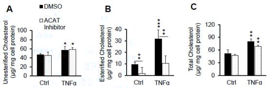 It has been reported that TNFα induces cholesteryl ester accumulation in monocytes through enhanced ACAT activity in the presence of oxLDL []. To evaluate the extent to which enhanced ACAT activity is responsible in raising pHAEC cholesterol in the presence of LDL, the cells were treated with or without ACAT inhibitor, Sandoz 58-035. As reported in Figure 2A,B, the inhibition of ACAT activity slightly raised the unesterified cholesterol, and significantly suppressed cholesteryl ester accumulation. Despite this inhibition, the TNFα-induced total cholesterol accumulation, now mainly in the unesterified form, was not prevented (Figure 2A,C). ACAT inhibition also reduced the total cholesterol in the cells, with or without TNFα stimulation (Figure 2C). This is a known effect of ACAT inhibition. The higher elevated unesterified cholesterol is more likely to be effluxed from the cells than the esterified one [].