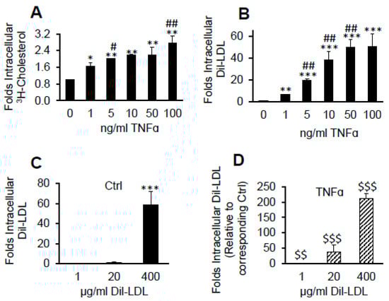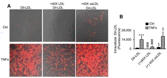 LDL oxidation is not required for TNFα-induced LDL accumulation. (A,B) Cells were treated with 0 (Ctrl) or 100 ng/mL TNFα (TNFα) for 24 h in serum medium. The media were replaced with serum-free media in the continued presence of TNFα for 2 h to remove surface lipoproteins. Finally, 5 µg/mL Dil-LDL in serum-free medium (Dil-LDL) ± 40 times LDL (+40× LDL) or oxLDL (+40× oxLDL) was added, followed by 3 h incubation. The images are 20× magnifications. n = 3. ***, p < 0.001 vs. Ctrl. $, ###, p < 0.05, 0.001, relative to Dil-LDL alone.