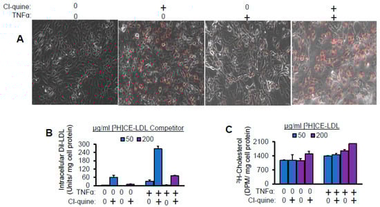 Lysosomal inhibitor enhances TNFα-induced LDL lipid accumulation. The cells were pre-treated with 0 or 100 ng/mL TNFα (+) for 24 h in the presence of serum. Subsequently, in the continued presence of TNFα, the cells were treated with 0.5 µg/mL Dil-LDL, plus 50 or 200 µg/mL [3H]CE-LDL, and containing 0 or 50 µM chloroquine diphosphate (Cl-quine), +, a lysosomal blocker, without serum. After 24 h, the intracellular fluorescence (A,B) or radioactivity (C) was determined. The separation of #cells in A is an artificact of preparation prior to lysing the cells for radioactivity. The circumferential accumulation of the Dil-LDL in the presence of chloroquine is apparent (A). The images are 20× magnifications. n = 2.