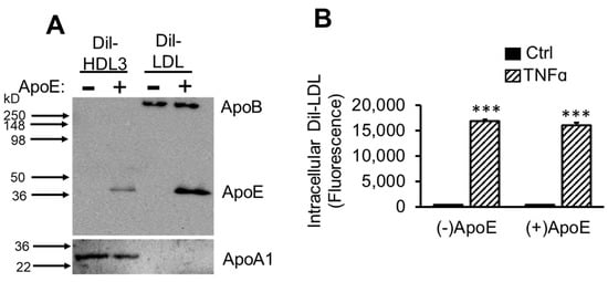 Apolipoprotein B (apoB) is the major protein in LDL []. However, variable amounts of apoE are also present in LDL []. Since apoE plays a major role in binding several lipoprotein receptors of the LDLR family [,], the effect of apoE depletion on TNFα-induced Dil-LDL intracellular levels was investigated. The successful depletion of apoE from Dil-HDL3 and Dil-LDL can be seen in Figure 6A. That both HDL3 and LDL contain apoE, while apoA1 and apoB are present in significant amounts only in HDL3 and LDL, respectively, is apparent in the figure. Data in Figure 6A also show that apoE represented a small proportion of the total LDL particle, but a larger fraction in HDL3. The apoB protein is nearly equal with or without apoE depletion, whereas apoA1 is noticeable less. That equal protein was loaded is presented in the Supplementary Material, Figure S3. In Figure 6B, it can be seen that the isolation procedure did not inhibit the ability of TNFα to induce Dil-LDL accumulation. Further, apoE depletion had no effect in this regard.