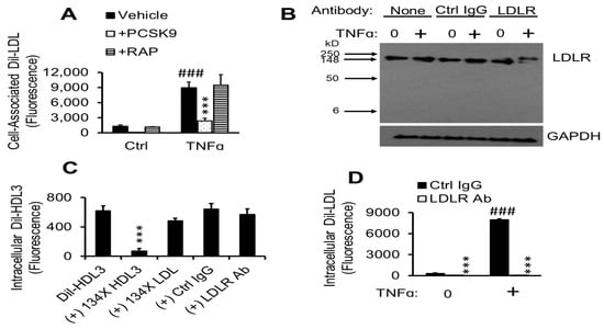 Having found evidence that TNFα promotes cholesterol accumulation in pHAECs through the endocytosis of native LDL, I next investigated what members of the LDLR family are responsible. As can be seen in Figure 7A, the pan-LDLR family blocker PCSK9 [,,], but not RAP [], suppressed the Dil-LDL accumulation. To investigate the contribution of LDLR in mediating TNFα-induced Dil-LDL accumulation, an LDLR antibody was investigated for its specificity and function in pHAECs treated with or without TNFα. As can be seen in Figure 7B, the antibody recognized a single protein consistent with the expected migration position of LDLR. It can be seen that incubation of TNFα-treated cells with the antibody induced an upward migratory shift in LDLR protein to a larger extent than in control cells. Attempts to directly detect the LDLR antibody were unsuccessful, suggesting that the shift is due to another interaction or modification.