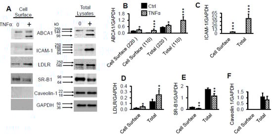 Having determined that LDLR is responsible for TNFα-induced LDL accumulation in pHAECs, I next tested whether the total and surface LDLR is changed by TNFα. As can be seen in Figure 8A,D, TNFα-induced an upregulation of the LDLR protein total and surface by about 90% and 138%, respectively. ABCA1 (Figure 8A,B) and ICAM-1 (Figure 8A,C) proteins, both of which have been reported to be induced by TNFα treatment [,,], were found to be significantly increased as well. A low molecular weight form of ABCA1, however, was primarily induced in TNFα-treated cells. In contrast, scavenger receptor B1 (SR-B1) was downregulated by TNFα (Figure 8A,E). Similar findings have been reported on hepatocytes []. Figure 8A also shows that the intracellular proteins GAPDH were undetectable at the cell surface. Although caveolin-1 has been reported to be closely associated with the inner plasma membrane [,], it was not detected in the cell surface assay. This indicates that the outer plasma membrane proteins were selectively labeled.