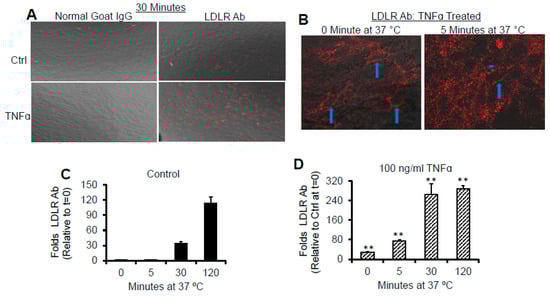 Confluent pHAECs in serum medium were incubated with 0 or 100 ng/mL TNFα for 24 h. Subsequently, the media were replaced with serum-free medium containing 10 µg/mL normal goat IgG or LDLR Ab (R&D Systems) in the continued presence of 0 or 100 ng/mL TNFα for 0, 5, 30, or 120 min at 37 °C. Afterwards, the cells were chilled on ice and further incubated at 4 °C for 1 h. Then the cells were washed 2× with ice-cold mHBSS, fixed with ice-cold methanol at −20 °C for 10 min, washed once with mHBSS at room temperature, then blocked with 50% human serum in mHBSS, 0.1% sodium azide (blocking buffer) for 1 h at room temperature. Afterwards, it was replaced with 4 µg/mL red antigoat antibody in blocking buffer. Following 30 min incubation at room temperature, the medium was replaced with mHBSS, washed 3× with blocking buffer (10 min each at room temperature), fixed with 4% paraformaldehyde in PBS, followed by fluorescence microscopy.