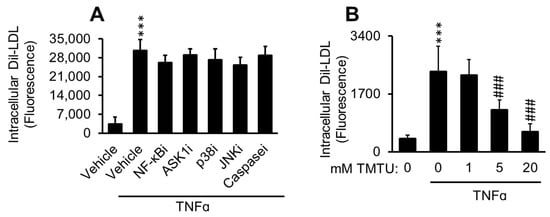 TNFα signaling cascade involves multiple mediators, among which are the transcription factor, NF-κB, and apoptosis signal-regulating kinase 1 (ASK1), an upstream mediator of JNK and p38 [], that facilitate apoptosis. To evaluate whether these proteins are upstream in the TNFα-induced Dil-LDL accumulation, experiments were performed in the presence of their respective inhibitors. As can be seen in Figure 10A, the inhibitors did not suppress the action of TNFα. In contrast, the antioxidant, TMTU, inhibited this effect with increasing doses (Figure 10B).