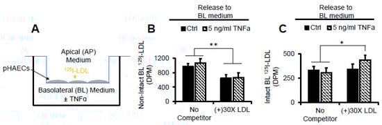 TNFα does not affect AP to BL release of degraded LDL protein. (A) Diagram of the experimental setup in (B,C) in which pHAECs were grown to confluence on 3 µm (pore size) polycarbonate filters, with 125I-LDL in the AP medium. (B) pHAECs in serum medium were pre-treated with 0 (Ctrl) or 5 ng/mL TNFα on the BL side for 48 h as described under Materials and Methods, Transwell Insert Experiments. Under serum-free conditions, 10 µg/mL 125I-LDL was added to the AP side (No Competitor) or with 30 folds unlabeled LDL, (+) 30× LDL, in the continued presence of TNFα. After 3 h, the BL media were collected, and non-intact 125I-LDL was measured as described under Experimental Procedures. (C) The experiment was performed as in B, followed by detection of intact BL 125I-LDL. n = 3. *,**, p < 0.05, 0.01, respectively.