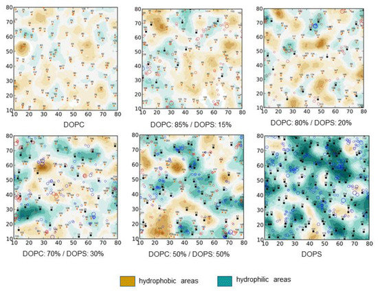 Dependence of the “dynamic molecular portrait” (DMP) of the DOPC/DOPS lipid bilayers on the DOPC:DOPS ratio. Results of all-atom MD simulations. DMPs are given in terms of 2D-maps of MHP of the bilayer surface (see legend to Figure 1) averaged over MD trajectory. Bilayer content is indicated under each panel. In-plane projections of lipid centers of mass are shown with small circles. Other MD details are described in [72].