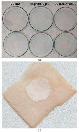 In our study, it has been investigated the applicability of BC membrane in transdermal drug delivery systems, wherein the permeation of two ibuprofen derivatives ([ValOiPr][IBU] and [LeuOiPr][IBU]), was compared with the permeation of the free acid (IBU). Permeation through porcine skin at 37 °C was studied using the Franz diffusion cell. The porcine skin is frequently used for preliminary evaluation of percutaneous permeation of transdermally applied drugs. Numerous histopathological studies confirmed its similarity to human skin [25,26].