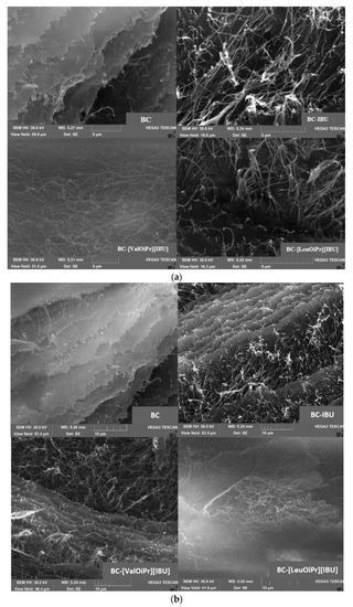 The uniformity of the BC membranes was further confirmed by surface SEM analysis (Figure 2). The SEM images disclosed also, a good dispersion of ibuprofen and ibuprofen derivatives in the BC membranes surface, as no formation of considerable aggregates or crystallized drug is perceivable. In pure BC membranes, fewer spaces between the nanofibrils were observed because of the collapse of the structure upon drying, while in the BC-ibuprofenate membranes these spaces were wider, showing a more open structure, because of the presence of API. Ibuprofen or ibuprofen amino acid isopropyl ester salts will be retained inside the BC network, reducing the attraction forces between the nanofibrils, maintaining some mobility of the nanofibres, and therefore, avoiding their collapse during drying and keeping some flexibility. At the same time, it can be seen in Figure 2b that the cellulose has retained its original structure.