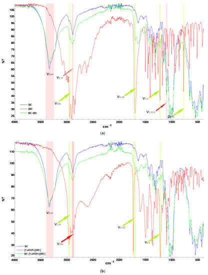 3.3. Preparation of Bacterial Cellulose (BC), Bacterial Cellulose Loaded Ibuprofen (BC-IBU), Bacterial Cellulose Loaded L-Valine Isopropyl Ester Ibuprofenate (BC-[ValOiPr][IBU]), and Bacterial Cellulose Loaded L-Leucine Isopropyl Ester Ibuprofenate (BC-[LeuOiPr][IBU])-Membranes