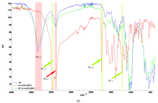 FTIR-ATR spectra of bacterial cellulose and API (a) BC (blue), IBU (red) and BC-IBU (green), (b) BC (blue), [ValOiPr][IBU] (red), and BC-[ValOiPr][IBU] (green), (c) BC (blue), [LeuOiPr][IBU] (red), and BC-[LeuOiPr][IBU] (green).