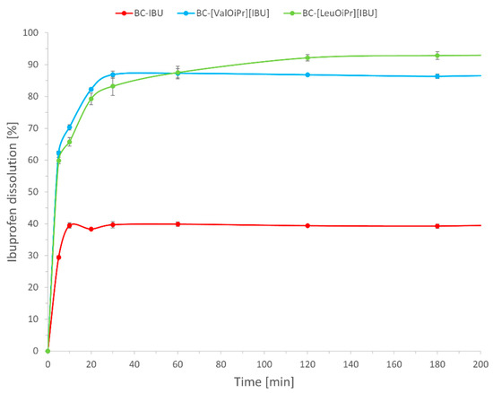 Dissolution profiles of BC-IBU, BC-[ValOiPr][IBU] and BC-[LeuOiPr][IBU]. Mean values ± standard deviation, n = 3.