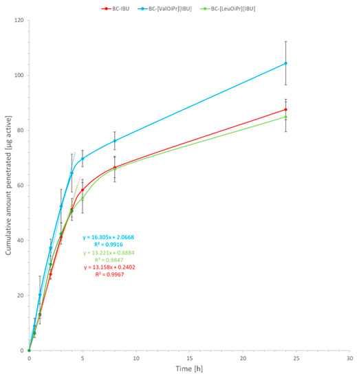 In our study, the rate permeation of IBU derivatives and acid IBU from BC to acceptor liquid is showed in Figure 7. IBU derivatives permeated from BC fastest in the first hours of the study. The sudden increase in permeation was observed in 0.5–1 time point (0.5–1 h) for [ValOiPr][IBU] and in 1–2 time point (1–2 h) for [LeuOiPr][IBU]. In contrast, IBU permeated at a constant level of 4–5 h (Figure 7), which would mean that the introduced modification of ibuprofen would allow obtaining a faster therapeutic effect.