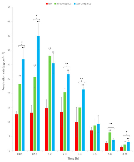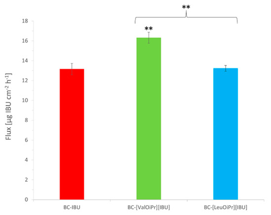 The permeation rate of IBU, [ValOiPr][IBU], and [LeuOiPr][IBU], permeated from BC into acceptor fluid. Mean values ± standard deviation, n = 3. Statistically significant difference from IBU was estimated using the ANOVA test. Double asterisk ** means statistical difference for p < 0.01, single asterisk * means statistical difference for p < 0.05. Brace { means statistical difference between two ibuprofenate salts.