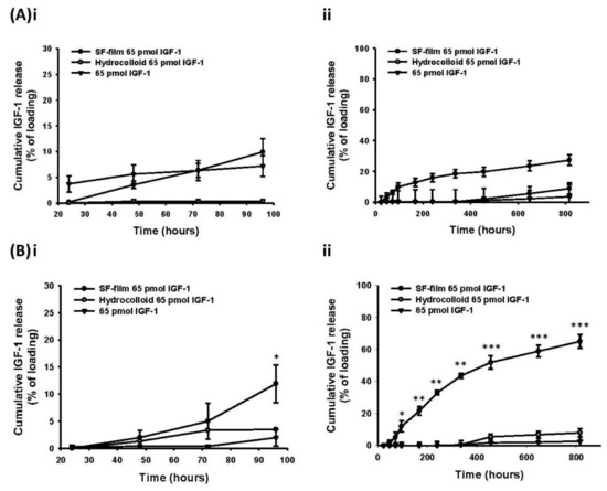 Release profiles of insulin-like growth factor 1 (IGF-1)-loaded silk fibroin film (IGF-1-loaded SF film), IGF-1 loaded onto SF films or hydrocolloid dressing. (A) The cumulative release curve of 65 pmol IGF-1 (i) from 24 to 96 h, and (ii) 24 to 816 h at 4 °C. (B) The cumulative release curve of 65 pmol IGF-1 (i) from 24 to 96 h, and (ii) 24 to 816 h at 37 °C. (●) SF films loaded with IGF-1; (◯) Hydrocolloid loaded with IGF-1; (▼) IGF-1 alone, * p < 0.05, ** p < 0.01, *** p < 0.001 in comparison with IGF-1 alone treatments (n = 3, ± SEM) using a Dunnett’s t test.