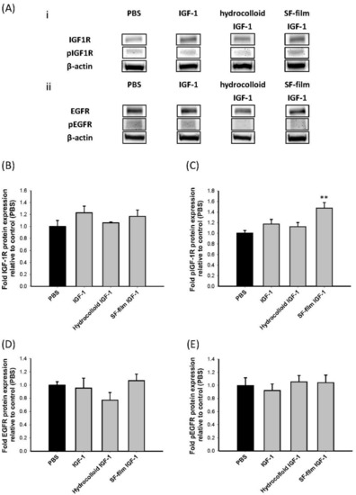 Immunoblotting for insulin-like growth factor type 1 receptor (IGF1R) or epidermal growth factor receptor (EGFR) and phosphorylated IGF1R or EGFR pathway from wound tissues of diabetic mice following treatment with PBS (control), native insulin-like growth factor 1 (IGF-1), a commercial dressing product (hydrocolloid IGF-1), and IGF-1-loaded SF film (SF film IGF-1) treatments. (A) Representative Western blot of db/db mice treated with different treatments 13 days post-wounding. (i) represents IGF-1 receptor (IGF1R) and phosphorylated IGF1R protein expression. (ii) represents EGF receptor (EGFR) and phosphorylated EGFR protein expression. Actin was used as a loading control. Quantification of (B) IGF1R protein expression; (C) phosphorylation of IGF1R; (D) EGFR protein expression; and (E) phosphorylation of IGF1R. Significant differences between control (PBS) and other treatments were determined using Dunnett’s multiple comparison post hoc test. ** p < 0.01; n = 5; ±SEM.