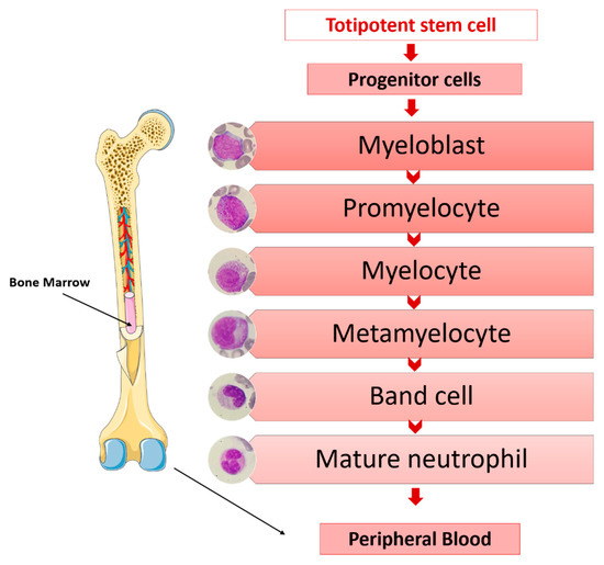 - Cowland, J.B.; Borregaard, N. Granulopoiesis and Granules of Human Neutrophils. Immunol. Rev. 2016, 273, 11–28. [Google Scholar] [CrossRef] [PubMed]