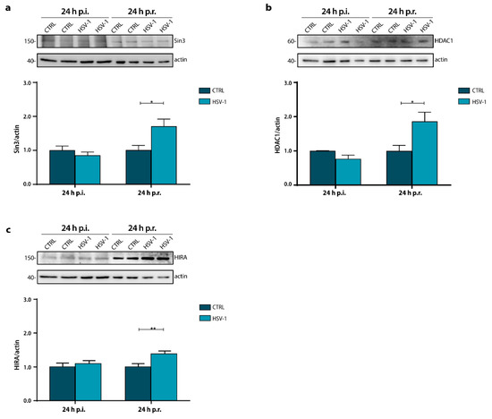 To gain insight into the decrease in H3K56ac, we investigated whether HSV-1 infection and reactivation could affect the expression levels of the components of the repressor complex Sin3a/HDAC1, known to be involved in histone deacetylation. Results showed a significant increase in Sin3 and HDAC1 levels in HSV-1 infected neurons 24 h p.r. with respect to matched CTRL, whereas no significant changes were detected 24 h after the primary infection (Figure 2a,b; 24 h p.r.: Sin3, * p = 0.017 vs. CTRL; HDAC1, * p = 0.035 vs. CTRL). These results were congruent with the decrease found in H3K56ac level suggesting that recurrent HSV-1 infection, and not primary infection, by affecting these protein levels, may modulate the histone acetylation ones. However, we also observed a time-dependent increase in the expression levels of both proteins, probably due to the HSV-1 latent and long-term infection.