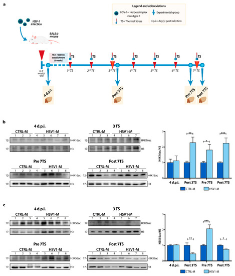 Schematic representation of the recurrent HSV-1 infection and modulation of histone acetylation levels in vivo. (a) Timeline showing HSV-1 infection, TS-induced virus reactivations, and chosen experimental time-points over the mouse life. The HSV-1 inoculation (primary infection) was performed by snout abrasion (first red arrow). TS induces viral reactivations are indicated by red arrows. The dashed line indicates the establishment of the latent infection. Mice were sacrificed and analyzed at the following time points (blue dots) indicated by the yellow boxes: 4 d.p.i., following the 3rd (at 6 months of age, Post 3TS) and the 7th TS (13 months of age, Post 7TS) or 24 h just before the 7th TS (Pre 7TS). Representative WBs showing H4K16 (b) and H3K56 (c) acetylation levels in the whole lysate from the cortices of 4 d.p.i., Post 3TS, Pre and Post 7TS mice. Densitometric analyses were performed with ImageLab software and normalized to H3 or tubulin expression. The values represent the normalized fold-changes in protein levels from HSV1-M with respect to CTRL-M. Data are mean ± SEM. * p < 0.05; ** p < 0.01; *** p < 0.001. Statistical significance was calculated by multiple t-test and determined using the Sidak–Bonferroni method, with alpha = 0.05.
