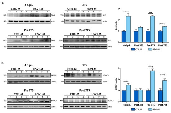 Then, to verify if multiple cycles of viral latency and reactivation could also affect Sin3 and HDAC1 levels, we investigated their protein levels in mouse cortices. We found a significant increase in Sin3 and HDAC1 protein expression levels in 4 d.p.i. HSV1-M with respect to CTRL-M (Figure 4a; 4 d.p.i.: Sin3, * p = 0.010 vs. CTRL-M; Figure 4b, HDAC1, * p = 0.046 vs. CTRL-M). Moreover, this trend was observed also after multiple viral reactivations (Figure 4a; Post 7TS Sin3, *** p < 0.001 vs. CTRL-M; Figure 4b, HDAC1, ** p = 0.008 vs. CTRL-M). The most consistent increase in Sin3/HDAC1 levels was found in Pre 7TS mice, i.e., when the virus was in the latent phase, compared to matched controls (Pre 7TS: Sin3, *** p < 0.0001 vs. CTRL-M; HDAC1, ** p = 0.006 vs. CTRL-M). Indeed, the levels of both Sin3 and HDAC1 were markedly higher than those found in mice subjected to TS-induced reactivation. These results confirm the Sin3 and HDAC1 expression observed in vitro, picturing a complex virus-host cell relationship throughout host life/time.