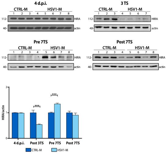 Next, we checked whether modulation of HIRA expression occurred also during the recurrent HSV-1 infection in our mouse model. In marked contrast to what we found in 24 h p.r. neurons, results showed a drastic reduction (up to 50%) in HIRA protein amounts following the 3rd TS in HSV1-M with respect to matched controls (Figure 5; bar plot; Post 3TS: *** p < 0.0001 vs. CTRL-M). A lower trend of decrease was also found in HSV-1-infected Post 7TS mice, suggesting an effect of viral reactivation on the protein half-life in mouse cortex. On the contrary, we detected a notable increase of HIRA levels in Pre 7TS HSV1-M, as shown in Figure 5 (bar graph; Pre 7TS: *** p = 0.0004 vs. CTRL-M). These levels were significantly higher than those found in both Post 3TS and Post 7TS HSV-1-infected mice. This result suggests that, after several cycles of TS, HIRA is more produced or preserved, and accumulates in cortical neurons during the viral latency. Consistently, the slight HIRA modulation found in HSV1-M Post 7TS may result from a balance between the aging-dependent accumulation of HIRA and the HSV-1-induced downregulation. Notably, no differences were observed 4 d.p.i. This probably depends on the number of neurons infected after only 4 days from primary infection and the total amount of HIRA in 6–8 weeks-old mice.