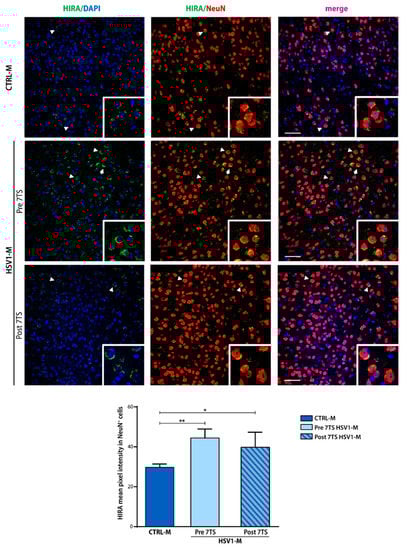 To gain insight into these results, we carried out confocal immunofluorescence analyses (IF) of mouse brain slices to investigate the localization of HIRA protein (Figure 6). IF staining was performed on brain slices obtained from CTRL-M and HSV1-M sacrificed 24 h before or after the 7th TS with a specific anti-HIRA protein antibody (green). Slices were also stained with anti-NeuN antibody (red) to mark nuclei and perinuclear cytoplasm of neurons, and diamidino-2-phenylindole (DAPI, blue) to stain all cellular nuclei. Confocal IF analysis confirmed the trend we previously observed in WB. Specifically, the mean fluorescence intensity of neuronal HIRA protein (i.e., detected in NeuN+ cells) was found to be significantly increased in Pre 7TS HSV1-M with respect to age-matched control mice (Figure 6; Pre 7TS ** p = 0.004 vs. CTRL-M). Moreover, HIRA seems to be affected by virus reactivation as its intensity was found slightly decreased in Post 7TS HSV1-M tested compared to Pre 7TS mice, although it was significantly higher with respect to matched CTRL-M (Figure 6; Post 7TS * p = 0.02 vs. CTRL-M). Furthermore, the nuclear localization of the protein changed in the infected Pre 7TS where HIRA was distributed perinuclearly in a more extensive way, contrary to CTRL-M, where HIRA was localized in more compact foci. Similarly, this occurred also in the Post 7TS, although the quantity of the protein decreased after reactivation.