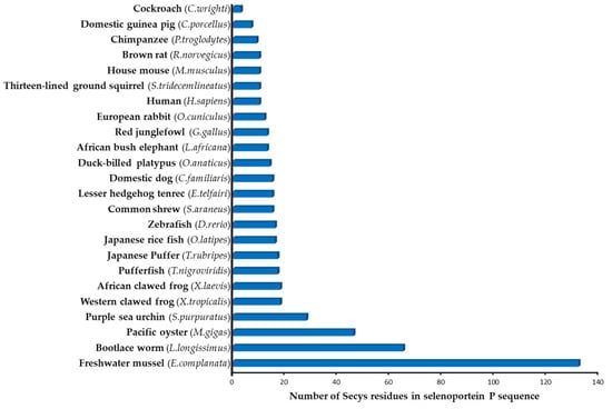 Selenoprotein P is unique amongst all the characterized selenoproteins in that it contains multiple SeCys residues, whereas all other selenoproteins contain only one SeCys. The number of SeCys residues in SELENOP from different organisms varies (Figure 1), amounting to 10 for humans, 46 in oysters [11] and 132 in one-species bivalves [13].