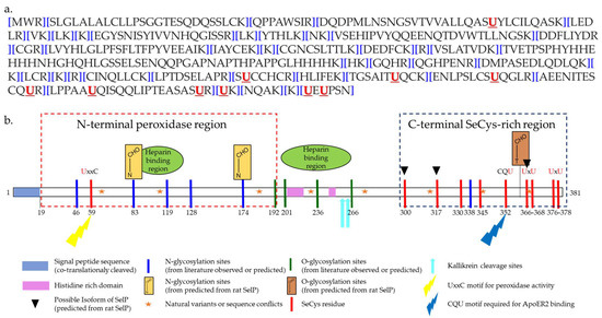 The matured predominant isoform of human SELENOP consists of 359 amino acids (AA) after cleavage of the predicted signal peptide (AA 1–21) [47] (Figure 2a). The selenium content (as SeCys) of SELENOP is distributed into two parts [21,47]. The N-terminal domain contains one selenocysteine at the 40th amino-acid in a U-x-x-C redox motif. The shorter C-terminal domain contains multiples selenocysteine, up to 9 in total for rats, mice, and humans [50,51] The N-terminal domain is responsible for the enzymatic activity of this protein, while the C-terminal domain acts as the Se supplier [52] (Figure 2b).