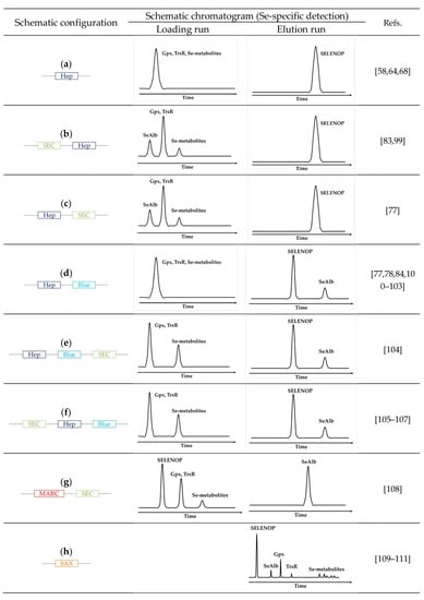 Schematic overview of the principle of HPLC configuration coupled with ICP-MS for SELENOP determination (a) schematic chromatogram of affinity column heparin coupled with ICP-MS (Se-specific detection) [58,64,68], (b) schematic chromatogram of a size exclusion column followed by an affinity column Heparin coupled with ICP-MS (Se-specific detection) [83,99], (c) schematic chromatogram of affinity column heparin followed by a size exclusion column coupled with ICP-MS (Se-specific detection) [77], (d) schematic chromatogram of multi-affinity columns heparin followed by blue-sepharose coupled with ICP-MS (Se-specific detection) [77,78,84,100,101,102,103], (e) schematic chromatogram of multi-affinity columns heparin followed by blue-sepharose and a size exclusion column coupled with ICP-MS (Se-specific detection) [104], (f) schematic chromatogram of a size exclusion column followed by multi-affinity columns heparin and blue-sepharose coupled with ICP-MS (Se-specific detection) [105,106,107], (g) schematic chromatogram of multi-affinity removal column followed by size exclusion column coupled with ICP-MS (Se-specific detection) [108], (h) schematic chromatogram of a strong anion-exchange column coupled with ICP-MS (Se-specific detection) [109,110,111], (Hep: HiTrap Heparin affinity column, SEC: Size-exclusion chromatography, Blue: HiTrap Blue affinity column, MARC: Multi-affinity removal column, SAX: Strong anion-exchange column).