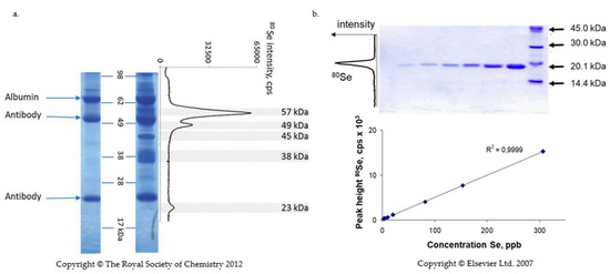 The migration of 75Se radioactivity in the gel played a fundamental role in the early works, allowing for the discovery and rough characterization of SELENOP [17,18]. The comparison of the radioactivity in the band with that of a standard is a straightforward method of quantification. An additional advantage is a convenient evaluation of SELENOP recovery from the gel. The inconvenience is the need for handling gamma-radioactivity which requires dedicated laboratories. Note that the technique requires that the quantified 75Se is present in the radioactive form. Whereas it is an elegant quantification technique in animal studies, it is not an option for human SELENOP.