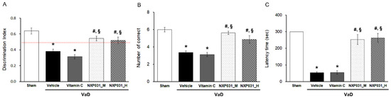 Effect of NXP031 on CCH-induced cognitive impairment using the NOR, radial 8-arm maze, and passive avoidance tests. (A) In the NOR test, rats treated with NXP031 showed significantly improved discrimination index (DI) compared to vehicle-treated rats. (B) In the radial 8-arm maze test, rats treated with NXP031 showed a significantly improved number of correct choices compared to vehicle-treated rats. (C) In the passive avoidance test, rats treated with NXP031 showed significantly increased latency times of suppression of behavior quantified on the basis of freezing compared to vehicle-treated rats. The data are presented as the mean ± S.E.M. * p < 0.05, compared with the sham group. # p < 0.05, compared with the VaD group. § p < 0.05, compared with the VaD + vitamin C group.