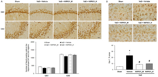 We evaluated the effect of NXP031 on CCH-induced neuronal cell death in the hippocampus through immunohistochemistry using the neuronal marker NeuN. Spatial learning and memory are hippocampal-dependent cognitive functions involving the hippocampal CA1 and CA3 pyramidal neurons. Figure 2A shows representative photomicrographs of NeuN immunostaining in the hippocampal CA1 and CA3 regions for all groups. The sham and VaD groups had similar NeuN-positive cell counts in the hippocampal CA1 and CA3 regions. We evaluated the effect of NXP031 on CCH-induced microglial activation in the hippocampus through immunohistochemistry with the microglial marker Iba-1. CCH significantly increased Iba-1 expression in the hippocampus. We measured the area percentage of Iba-1-expressing microglia in the hippocampal CA1 region. NXP031 reduced the CCH-induced Iba-1-expressing microglia (Figure 2B).