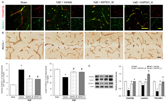 Effect of NXP031 on CCH-induced microvessels damage and BBB disruption in the hippocampus. (A) Representative photographs of immunofluorescence staining of PDGFRβ (red) and RECA-1 (green) in the hippocampal CA1 region after CCH. (B) Representative photographs of immunostaining of RECA-1 in the hippocampal CA1 region after CCH. NXP031 reduced the number of microvessels < 10 μm in the hippocampus. (C) Representative bands of PDGFRβ, Laminin, PECAM-1 protein expression in the hippocampus after CCH. The data are presented as the mean ± S.E.M. * p < 0.05 compared with the sham group. # p < 0.05, compared with the VaD group. Scale bar: 50 μm.