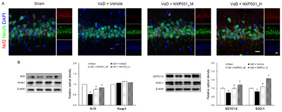 Effect of NXP031 on CCH-induced Nrf2 dysfunction in the hippocampus. (A) Representative photographs of immunofluorescence staining of Nrf2 (red) and NeuN (green)-positive cells in the hippocampal CA1 region after CCH. (B) Representative bands of Nrf2, keap1, GSTO1/2, and SOD-1 protein expression in the hippocampus after CCH. The data are presented as the mean ± S.E.M. * p < 0.05 compared with the sham group. # p < 0.05, compared with the VaD group. Scale bar: 20 μm.