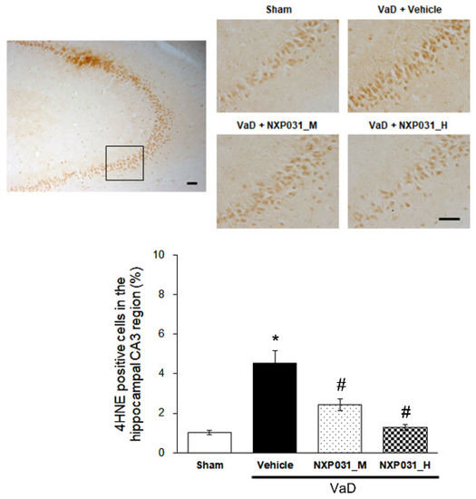 Effect of NXP031 on CCH-induced 4HNE production in the hippocampal CA3 region. Representative photographs of immunostaining of 4HNE expression in the hippocampal CA3 regions after CCH. The data are presented as the mean ± S.E.M. * p < 0.05, compared with the sham group. # p < 0.05, compared with the VaD group. Scale bar: 100 μm.
