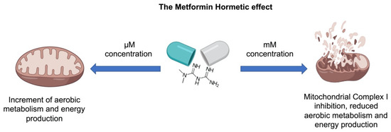 The use of MTF progressively expanded from diabetes to obesity, liver disease, and, finally, cancer therapy. Interestingly, MTF is an example of hormesis, the dose–response phenomenon characterized by a low dose stimulation and high dose inhibition, resulting in an adaptive response to cellular metabolism variations. In detail, millimolar MTF concentrations, used in vitro, caused inhibition of the mitochondrial Complex I, a decrement in chemical energy production, and the consequent activation of the AMPK pathway (Figure 2). Conversely, micromolar MTF concentrations, which correspond to the therapeutic dosage, activated the mitochondrial aerobic metabolism, improving the cellular energy status. It appears that this peculiarity of the mode of action of MTF should be considered when the observations from in vitro studies are translated into in vivo treatments, bearing in mind the different tissue concentrations/accumulation of MTF. Based on the concept of hormesis, this review provides a comprehensive justification of the apparently opposite effects of MTF on single organs, in face of its overall beneficial effect. Currently, the MTF dose (generally, 500–2500 mg/die) depends mainly on the goal of glycated hemoglobin to be achieved. Indeed, it is difficult to estimate the actual concentration of MTF in the various tissues, as it may also differ in a single individual due to the clinical characteristics of each patient. The concept of hormesis can be useful to fully understand the effects of MTF in each patient, thus obtaining effective tailoring of MTF therapy, not only in diabetes.