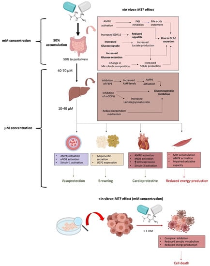 Schematic representation of the effects of micromolar (μM) or millimolar (mM) metformin (MTF) concentrations. The upper part of the figure represents the effect of MTF at the therapeutic concentration (in vivo—millimolar in liver and micromolar in the rest of body). The lower part of the figure depicts the effect of MTF at doses usually used in vitro experiments (millimolar).