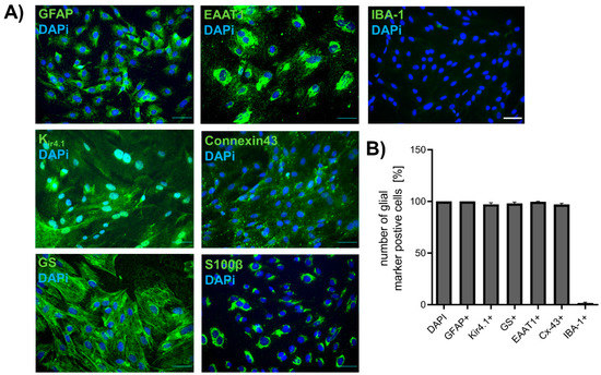 To determine the purity of spinal astrocyte culture, the cells were incubated with primary antibodies specific for glial fibrillary acidic protein (anti-GFAP, rabbit, 1:400, Sigma-Aldrich, Taufkirchen, Germany), connexin-43 (anti-Cx-43, rabbit, 1:500; Sigma-Aldrich, Taufkirchen, Germany), S-100β (anti-S100β, rabbit, 1:200, Thermo Fisher Scientific, Dreieich, Germany), β-III-tubulin (anti-Tuj1, mouse, 1:500 Sigma-Aldrich, Taufkirchen, Germany), glutamine synthetase (anti-GS, rabbit; 1:400, Sigma-Aldrich, Taufkirchen, Germany), Kir4.1 (anti-KCNJ10, rabbit, 1:500, Alomone Labs, Jerusamlem, Israel), and Iba-1 (anti-Iba-1, rabbit, 1:500, Thermo Fisher Scientific, Dreiech, Germany).