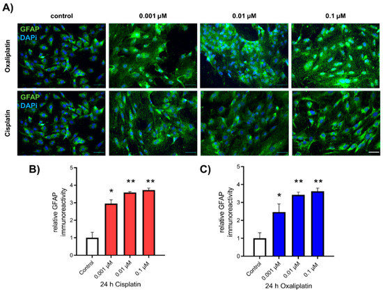 For examining the influence of cis- or oxaliplatin on the expression of GFAP in spinal astrocytes, as a marker for activation, cells were cultured and exposed to cis- or oxaliplatin in a concentration of 0.001 µM, 0.01 µM, or 0.1 µM for 24 h. Afterward, ICC for GFAP immunoreactivity was performed (Figure 2A). Untreated spinal astrocytes showed a GFAP protein level of 1.00 ± 0.31. When spinal astrocytes were exposed to cisplatin, all concentrations led to an increased relative GFAP protein level (0.001 µM: 2.95 ± 0.22, p < 0.05; 0.01 µM: 3.59 ± 0.05, p < 0.01; 0.1 µM: 3.72 ± 0.12, p < 0.01) (Figure 2B). Exposure of spinal astrocytes to oxaliplatin for 24 h showed similar results. The relative GFAP protein level was increased (0.001 µM: 2.46 ± 0.25, p < 0.05; 0.01 µM: 3.42 ± 0.15, p < 0.01; 0.1 µM: 3.62 ± 0.17, p < 0.01), compared to the control condition (Figure 2C). Additionally, expression of S100β and the production of reactive oxygen species (ROS), as other markers of astrocyte activity, were increased by cis- or oxaliplatin after 24 h (Figures S2 and S3, Supplementary Material).