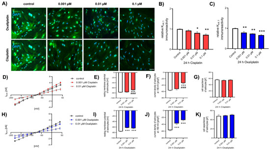 To evaluate the function of Kir4.1, patch-clamp measurements were performed (Figure 3D,H). When cultured spinal astrocytes were exposed to 0.01 µM cisplatin, the resting membrane potential was reduced (−68.36 ± 0.67 mV; p < 0.001), compared to the control conditions (−77.71 ± 0.66 mV) and to cells exposed to 0.001 µM cisplatin (−76.70 ± 0.70 mV, p > 0.05) (Figure 3E). Similar effects were observed for the current density; 0.001 µM cisplatin did not lead to an effect (−54.20 ± 2.89 pA/pF, p > 0.05), while 0.01 µM cisplatin reduced the current density of Kir4.1 (−33.24 ± 2.09 pA/pF, p < 0.001), compared to untreated control cells (−56.35 ± 1.29 pA/pF) (Figure 3F). Exposure of spinal astrocytes to cisplatin did not alter the capacity of the cells after 24 h (p > 0.05) (Figure 3G). When cultured astrocytes were exposed to oxaliplatin, all concentrations reduced the resting membrane potential (0.001 µM: −62.48 ± 0.67 mV, p < 0.001; 0.01 µM: −64.42 ± 1.72 mV; p < 0.001), compared to untreated cells (−78.88 ± 0.91 mV) (Figure 3I). The current density of Kir4.1 in spinal astrocytes was also reduced by exposure to 0.001 µM (−37.46 ± 3.08 pA/pF, p < 0.001) or 0.01 µM (−27.84 ± 2.75 pA/pF, p < 0.001) oxaliplatin (Figure 3J). Similar to cisplatin, the cell capacity of spinal astrocytes was not altered by oxaliplatin (p > 0.05) (Figure 3K).