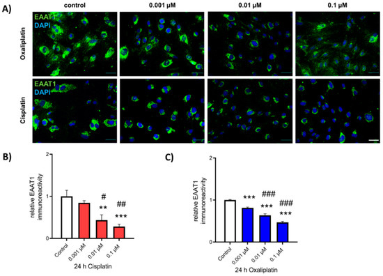 To determine the possible effects of cis- or oxaliplatin on the expression of glutamate-transporter EAAT1, cultured spinal astrocytes were exposed to chemotherapeutics as described above, and ICC for EAAT1 immunoreactivity was performed (Figure 4A). When spinal astrocytes were exposed to 0.01 µM or 0.1 µM of cisplatin for 24 h, relative EAAT1 protein level was reduced (0.01 µM: 0.43 ± 0.13, p < 0.01; 0.1 µM: 0.28 ± 0.05, p < 0.001), compared to untreated conditions (1.00 ± 0.01). No effect was observed when cells were exposed to 0.001 µM cisplatin (0.85 ± 0.05, p > 0.05). A concentration-dependent effect on the reduction of the EAAT1 IR was observed between 0.01 µM and 0.1 µM cisplatin (p < 0.05—p < 0.01) (Figure 4B). In contrast to cisplatin, exposure to oxaliplatin resulted in a concentration-dependent reduction of relative EAAT1 protein level for all concentrations (0.001 µM: 0.82 ± 0.02, p < 0.001; 0.01 µM: 0.64 ± 0.04, p < 0.001; 0.1 µM: 0.47 ± 0.03, p < 0.001) (Figure 4C).