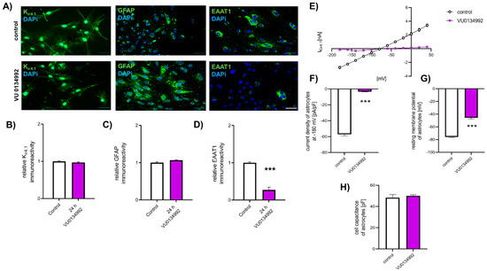 Extracellular uptake of glutamate strongly depends on the hyperpolarized membrane potential. Our study demonstrates a direct link between the downregulation of Kir4.1 and EAAT1. Using a specific Kir4.1 blocker led to nearly completely blocked channel currents, resulting in reduced current densities and decreased resting membrane potentials. Furthermore, the specific block of the Kir4.1 led to a downregulation of the EAAT1 protein. Due to the changed membrane potential, the ability of the astrocytes to uptake glutamate was inhibited [53,60]. Depolarization of the astrocytic membrane by reduction or inhibition of the Kir4.1 channel leads to a reduced potassium uptake and increases the extracellular potassium concentration, with subsequent changes in the electrochemical potassium gradient. Glutamate uptake by EAAT proteins depends on the sodium influx and the potassium efflux. Due to the increase of extracellular potassium concentration by Kir4.1 dysfunction, potassium can no longer leave the cell through EAAT1, resulting in reduced glutamate uptake [61,62,63]. These results suggest the proper function of the Kir4.1 channel in order to reach the hyperpolarized membrane potential and favor the astrocytes glutamate uptake [64,65,66]. When cultured control astrocytes were exposed to Kir4.1 inhibitor VU, a reduction of EAAT1 expression was observed, supporting the relationship between these two proteins. Interestingly, this inhibition did not increase GFAP expression significantly, suggesting a Kir4.1 independent mechanism.