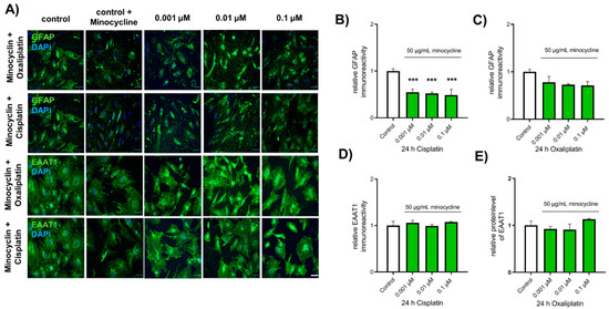 Influence of antibiotic minocycline on the expression of GFAP and EAAT1 in cultured spinal astrocytes. (A) Immunocytochemical staining of GFAP or EAAT1 (green) in cultured spinal astrocytes before or after exposure to minocycline and cis- or oxaliplatin. Nuclear DNA was stained with Dapi (blue). (B) When spinal astrocytes were pre-exposed to minocycline, cisplatin reduced the expression of GFAP compared to untreated control cells (*** p < 0.001). (C) When spinal astrocytes were pre-exposed to minocycline, oxaliplatin did not affect the expression of GFAP compared to untreated control cells (p > 0.05). (D,E) Cis- or oxaliplatin did not affect the expression of EAAT1 when spinal astrocytes were pre-exposed to minocycline (p > 0.05). * = significant difference to control. n = 9 experiments with each >100 cells. Scale 50 µm.