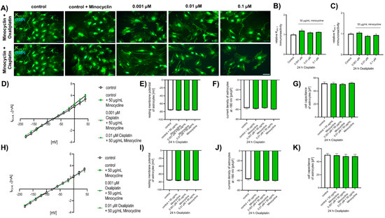 To examine the protective influence of minocycline on the functional modulation of Kir4.1, mediated by chemotherapeutics, patch-clamp measurements were performed. All observed effects of cis- or oxaliplatin on the resting membrane potential (p > 0.05) and the current density of Kir4.1 (p > 0.05) were abolished by pre-exposure to minocycline. Furthermore, the cell capacity was not affected by cis- or oxaliplatin (Figure 7D–K).