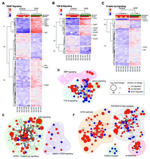 Thus, we aimed to investigate the impact of these signaling pathways (TGF-β-, G-protein activated-, and VEGF- signaling) in the VPP model in detail. Unsupervised hierarchical clustering of the samples that we generated on basis of the Reactome pathway database [16] for the VEGF (Figure 2A), TGF-β (Figure 2B) and G-protein mediated signaling pathways (Figure 2C) demonstrated a perfect separation of the genotypes, highlighting the dysregulation of these pathways in the VPP animals. Furthermore, k-mer analysis (three k-mer groups indicated by numbers on the left side of each heatmap) showed clusters of tightly co-regulated genes. We highlighted some genes of particular interest (e.g., which are known to be involved in neuroprotective or immune modulating processes or to be involved in regulatory functions) in each pathway on the right side of each heatmap. The heatmaps including the full labelling are shown in Supplementary Figure S3. To further analyze sub-groups of dysregulated pathways, we transformed the Reactome pathways into functional interaction networks (Figure 2D–F). We colored the genes of each network according to their dysregulation: white indicates no significant regulation, red genes were up- and blue genes were significantly down-regulated, respectively. The size of each node corresponds to the log2-fold change of regulation. The fully labeled networks are shown in Supplementary Figure S4. This analysis identified distinct sub-clusters of dysregulated genes, e.g., endothelin 2 (Edn2) and endothelin receptor b (Ednrb) in the G-protein activated signaling pathway network (Figure 2E and Supplementary Figure S4C) or Tgfbr2 in the TGF-β family signaling network (Figure 2D and Supplementary Figure S4B) and Vegfr2/kinase insert domain receptor (Kdr) in the VEGF signaling network (Figure 2F and Supplementary Figure S4A).