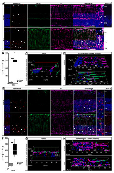 In addition to the quantitative information from the RNAseq data derived from whole retinae, and to further validate our results, we next performed mRNA in situ hybridization and/or immunofluorescence staining to identify cell types expressing transcripts of interest. Using a specific probe against Edn2, we detected Edn2 most prominently in the ONL in the control retina. However, we also observed distinct Edn2 signals in the INL and some rather sparse signals in the GCL (Figure 3A). VPP retinae showed significantly higher Edn2 expression in the RNAseq data (22.12-fold, padj = 8.68 × 10−87; Figure 3B, Supplementary Table S2, Supplementary Figure S1G) and accordingly showed a marked increase of Edn2 signals in particular in the degenerating ONL and in the INL, but the signals in the GCL remained sparse (Figure 3A). To identify specific cell types expressing Edn2, we combined in situ hybridization with immunofluorescence staining. We used glial fibrillary acidic protein (GFAP) as a marker for astrocytes and reactive Müller cells. GFAP is a major intermediate filament particularly expressed in astrocytes [17] and upregulated in response to retinal trauma in astrocytes and Müller cells [17,18]. Moreover, immunofluorescence staining for glutamine synthetase (GS) was used to label Müller cells [19]. When performing GFAP/GS/Edn2 co-labelling, we observed the characteristic GFAP staining pattern for astrocytes in the nerve fiber layer for both groups (Supplementary Figure S5A,B). Consistent with the observed upregulation of Gfap in VPP retinae as determined by RNAseq analysis (17.05-fold, padj = 3.87 × 10−78), immunofluorescence staining showed an increased GFAP signal intensity, indicating an enhanced protein expression, in the nerve fiber layer and an additional stripe-like staining pattern stretching through the retina, which represents the characteristic morphological appearance of reactive Müller cells. Of note, unlike apoptosis and ONL thinning (Supplementary Figure S1A,D,E), which were both more prominent in the central retina, we could not detect a difference in GFAP reactivity between the central (Supplementary Figure S5A,B) and the peripheral (Supplementary Figure S5A,C) parts of the retina (VPP animals (n = 3): GFAP-intensity central retina: 26,653.88 mean gray value/mm²; GFAP-intensity peripheral retina 50,308.26 mean gray value/mm², p = 0.10). In the 3D reconstruction of Edn2/GFAP/GS co-labelled sections, we observed some Edn2 signals in GFAP-positive astrocytes (Figure 3C and Supplementary Figure S6C) and in GS-positive resting and GFAP/GS-positive reactive Müller cells, respectively (Figure 3D and Supplementary Figure S6D). However, we observed the majority of the Edn2 signals in neurons of the INL and ONL (Figure 3A).