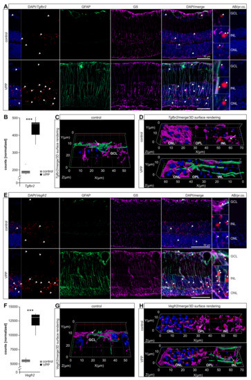 Upregulation of TGFβ- and VEGF-signaling in VPP mice. (A) In situ hybridization for Tgfbr2 (red, arrowheads) and GFAP (green)/GS (purple) immunofluorescence co-labeling in the retinae of three-month-old animals. Nuclei were DAPI-stained (blue). In the VPP retina, the number of Tgfbr2 signals (red, arrowheads) in the ONL and INL was increased and the Müller cells were GFAP/GS-positive. The boxed areas in the merge image are shown in high resolution on the right. (B) Boxplots showing the extracted Tgfbr2 expression data from the RNAseq as normalized counts for control and VPP genotypes. Control n = 6; VPP n = 5; *** padj = 2.18 × 10−23. (C,D) Higher magnification of the GCL (C) and ONL/OPL/INL region (D) depicted as 3D reconstruction (Tgfbr2/merge/3D surface rendering). (C) Tgfbr2 signals (red, arrow) showed only scattered co-labeling with GFAP (green)-positive astrocytes. (D) Tgfbr2 punctae (red, arrow) partly associated with GS (purple)-positive resting (control animal, arrow) and GFAP (green)/ GS (purple)-positive reactive (VPP animal, arrow) Müller cells. (E) In situ hybridization for Vegfr2/Kdr (red, arrowheads) and GFAP (green)/GS (purple) immunofluorescence co-labeling in the retinae of three-month-old animals. Nuclei were DAPI-stained (blue). The number of Vegfr2 signals (red, arrowheads) was increased in the VPP retina and the Müller cells were GFAP/GS-positive. The boxed areas in the merge image are shown in high resolution on the right. (F) Boxplots showing the extracted Vegfr2/Kdr expression data from the RNAseq as normalized counts for control and VPP genotypes. Control n = 6; VPP n = 5; *** padj = 1.40 × 10−41. (G,H) Higher magnification of the GCL (G) and ONL/OPL/INL region (H) depicted as a 3D reconstruction (Vegfr2/merge/3D surface rendering). (G) Vegfr2 signals (arrow) showed some co-labeling with GFAP (green)-positive astrocytes. (H) Vegfr2 signals partly overlapped with GS (purple)-positive resting (control animal, arrow) and GFAP (green)/GS (purple)-positive reactive (VPP animal, arrow) Müller cells. Tgfbr2 = transforming growth factor beta receptor type 2; Vegfr2 = vascular endothelial growth factor receptor 2; GCL = ganglion cell layer; INL = inner nuclear layer; OPL = outer plexiform layer; ONL = outer nuclear layer; AB/pr. co. = antibody/probe control.