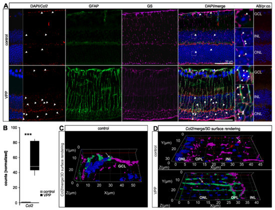 Upregulation of Ccl2 in VPP mice. (A) In situ hybridization for Ccl2 (red) and GFAP (green)/GS (purple) immunofluorescence co-labeling in the retinae of three-month-old animals. Nuclei were DAPI-stained (blue). In the control retina, a rather discrete Ccl2 signal (arrowheads) was visible. In the VPP retina, the number of the Ccl2 punctae increased (arrowheads) and the Müller cells were GFAP/GS-positive. The boxed areas in the merge image are shown in high resolution on the right. (B) Boxplots showing the extracted Ccl2 expression data from the RNAseq as normalized counts for control and VPP genotypes. Control n = 6; VPP n = 5; *** padj = 8.05 × 10−14. (C,D) Higher magnification of the GCL (C) and ONL/OPL/INL region (D) depicted as a 3D reconstruction (Ccl2/merge/3D surface rendering). (C) One of the few overlaps of the Ccl2 signals (red, arrow) with GFAP (green)-positive astrocytes. (D) Ccl2 punctae (red, arrow) partially overlapped with GS (purple)-positive resting (control animal, arrow) and GFAP (green)/ GS (purple)-positive reactive (VPP animal, arrow) Müller cells. GCL = ganglion cell layer; INL = inner nuclear layer; OPL = outer plexiform layer; ONL = outer nuclear layer; Ccl2 = CC-chemokine ligand 2; GS = glutamine synthetase; AB/pr. co. = antibody/probe control; AU = arbitrary unit.