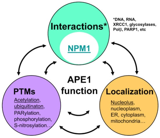 In addition to the direct contribution of the N-terminal tail to APE1 repair activities described above, this domain is important to finely tune APE1 function by additional mechanisms. Similar to most proteins, APE1 functionality is modulated by subcellular localization, post-translational modifications (PTMs), and interaction with other proteins (Figure 4). In this regard, the conformational flexibility of the N-terminal tail is ideally suited for harbouring cell localization signals, being the subject of PTMs and establishing interactions with other proteins. A crosstalk between these three factors further regulates APE1, which is described in detail below. For example, acetylation of residues in the N-terminal tail affects the subcellular localization of the protein, and also binding to NPM1. This interaction, in turn, determines APE1 enrichment in the nucleolus.