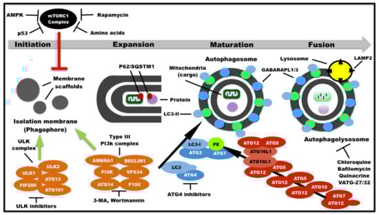 The mammalian autophagy pathway is a four-step process. Several environmental signals activate autophagy directly or indirectly, such as nutrient deprivation (e.g., amino acid depletion), DNA damage (p53-mediated transcription activation), developmental or environmental cues upstream of signaling pathways (e.g., adenosine monophosphate-activated protein kinase—AMPK), and mammalian target of rapamycin complex 1 (mTORC1) inhibitors (e.g., rapamycin). Autophagy initiation: cells exit homeostasis by inhibition the mTORC1 complex and induction of autophagy activating kinase 1/2 (ULK1/2) complex (formed by ULK1/2, autophagy-related protein 13—ATG13, PTK2/FAK family interacting protein of 200 kDa—FIP200, and Autophagy-related protein 101—ATG101 proteins) alongside type III phosphatidylinositol 3-kinase complex (formed by autophagy and beclin 1 regulator 1—AMBRA1, BECLIN1, PI3K, Vacuolar protein sorting 34—VPS34, beclin 1-associated autophagy-related key regulator/autophagy-related protein 14—ATG14, mammalian homolog of yeast Vps15—P150). This activation forms an isolation membrane (phagophore) by sequestering part of a cellular membrane enclosing a fraction of the cytosol. The phagophore contains cargo such as organelles and/or macromolecules sequestered by adaptors such as sequestosome1 (p62/SQSTM1). Expansion: the phagophore elongates and involves the cargo. The cysteine peptidase/autophagy-related protein (ATG4), which is a component of the ubiquitin-like ATG8 (Light-chain 3 (LC3)) system (blue), converts LC3 into LC3-I by proteolytic cleavage at the C-terminus. Further, both autophagy-related protein 3 (ATG3) and autophagy-related protein 7 (ATG7) conjugate LC3-I with the lipid phosphatidylethanolamine (PE). The LC3-I/PE aggregate anchored at the autophagosome membrane becomes LC3-II. Similarly, gamma-aminobutyric acid receptor-associated proteins (GABARAPLs) are subject to proteolytic cleavage at the C-terminus by ATG4 and conjugated to lipids by ATG3/ATG7 for phagophore membrane binding. LC3-II and GABARAPL conjugates contribute to membrane elongation, cargo recognition, autophagosome edge closure, autophagosomal movement, and tethering to lysosomes. The ubiquitin-like autophagy-related protein 12 (ATG12) system also contributes to ATG8 (LC3 and GABARAPL) conjugation. It initiates with an ATG12 cleavage by ATG7 in an ATP-dependent manner. Furthermore, ATG12 associates with autophagy-related protein 10 (ATG10), thus forming another intermediate. Finally, ATG12 conjugates with autophagy-related protein 5 (ATG5) and the latter interacts with autophagy related 16 like 1 (ATG16L1). Furthermore, a dimeric ATG12-ATG5-ATG16L1 complex forms by ATG16L1 homodimerization. This dimer complex contributes to ATG8-lipid conjugations. Maturation: The phagophore becomes a double-membrane enclosed vesicle named autophagosome. Fusion: the autophagosome fuses with a lysosome and becomes an autolysosome that allows complete degradation of cargo and release of cellular building blocks (e.g., amino acids and lipids) in the cytosol. The autolysosome formation requires the lysosome membrane-enriched glycoprotein lysosomal associated membrane protein 2 (LAMP2). Stage-specific autophagy inhibitors were described. 3MA: 3-methyladenine.